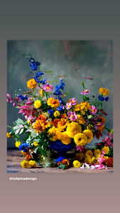 A captivating floral arrangement showcasing a vibrant mix of flowers in a charming vase. The flowers, painted with hues of yellow, blue, and pink, stand out against the backdrop. The arrangement is set on a surface that contrasts beautifully with the colors of the flowers.