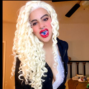 In this image, we see OnlyFans model Amber striking a playful pose in her black jacket. She's donned a long blonde wig that cascades down her shoulders and is paired with a short red dress that adds a pop of color to the outfit. The setting appears to be a cozy room, with a glimpse of a bookshelf in the background, suggesting a relaxed, homey atmosphere. Amber's pose, along with her wig and dress, give off a whimsical vibe, making the photo quite eye-catching.