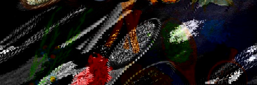 A display of various herbs, including dried leaves, flowers, and spices, arranged neatly in bowls and baskets. The table appears to be set up for display or preparation.