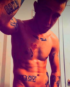 Alton Stone, an OnlyFans model known for his body art and tattoos, is seen in this casual image. He appears to be in a relaxed state with a humorous caption. His fit physique and distinctive tattoos are on full display.