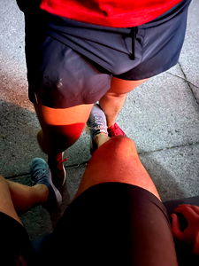 A snapshot of two runners sharing a moment, set against the backdrop of an urban environment.