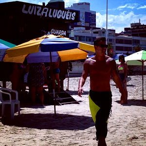 A photograph of a young adult male, likely in his late twenties to early thirties, standing on a sandy beach looking off to the side with an intense gaze. He has short hair and is wearing a tank top. The background is blurred but suggests a coastal setting, possibly taken during a sunny day.