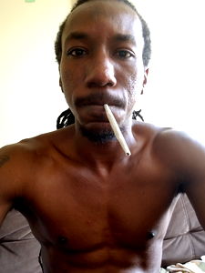 A shirtless man is seated, holding a lit cigarette in one hand and seemingly relaxed. He has short hair and appears to be in a casual pose with his body oriented towards the camera.