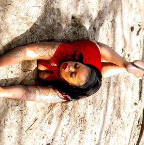 A professional model dressed in a vibrant red dress poses with confidence for her Onlyfans account, showcasing a dynamic and eye-catching look.