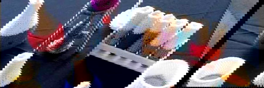 A crocheted setup for an experiment, with various materials and equipment on a table. It features a variety of colorful yarns in the form of lab equipment, including test tubes, beakers, and other craft items, suggesting a creative or educational activity with a science theme.
