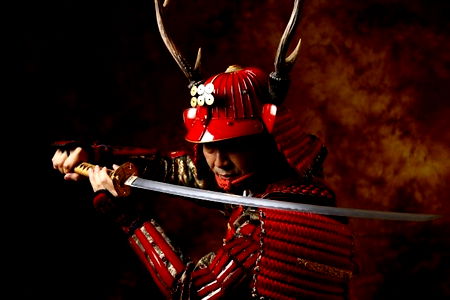 Stylized portrait of a person in traditional Japanese samurai armor, exuding an air of strength and honor. The individual's intense gaze captures the viewer's attention.