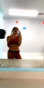 A young woman in a gym, taking a mirror selfie. She is standing in front of a bathroom mirror and appears to be engaged in some sort of fitness activity.