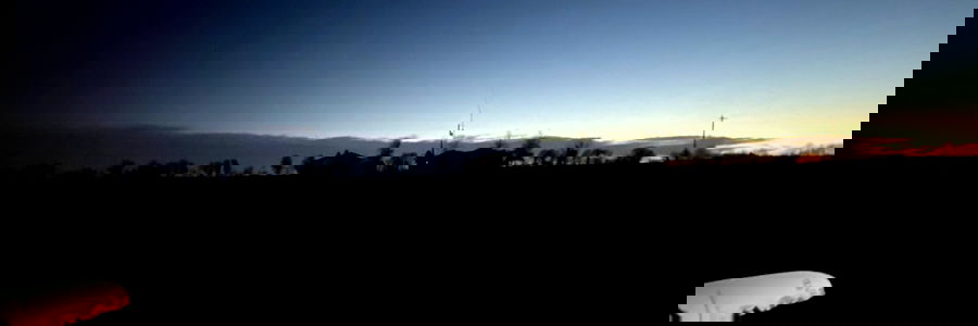 A dramatic image capturing the skyline during a stormy sunset with rain on the road, as seen from an overpass.