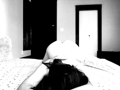 Image captures a moment of relaxation and allure. A young woman lays on her stomach, her hair cascading down in an intimate close-up shot. She is dressed in minimal clothing that accentuates the elegance of her form. The black and white filter adds to the timeless beauty of the scene.