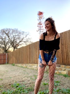 OnlyFans model Alz strikes a pose with sunglasses in bathroom mirror, exuding confidence and allure. She is seen wearing a skimpy outfit paired with fishnet stockings, embodying the style and glamour associated with her OnlyFans presence.