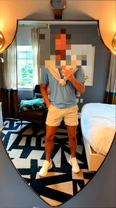 A man wearing a blue shirt, white shorts, and white shoes stands in front of a large mirror. He is holding up his phone as if taking a selfie. The mirror reflects the room behind him, which features patterned walls and a bed with a black headboard. He appears to be indoors, possibly in a hotel or private residence.