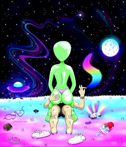 An erotic OnlyFans model, JJ, in a futuristic scene with an astronaut companion. The image captures the essence of space exploration and intimacy.
