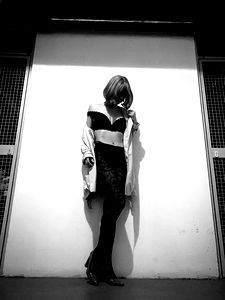 An intimate photograph of Amalia, a model in lingerie and stockings, captured from an angle that emphasizes her figure. She stands with confidence against a plain backdrop.