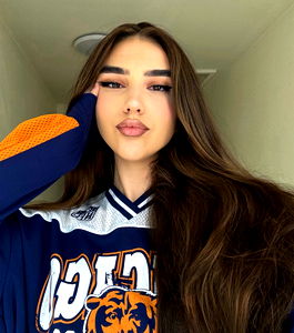 An image of a woman with long hair leaning on her hand, posing with a confident expression. She is wearing a sports jersey, and the background is neutral with white walls. The woman's attire suggests a casual or relaxed style, potentially associated with an athletic theme.