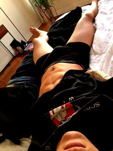 Amalla, the model from Panama, is seen in a comfortable and stylish pose. He is wearing a cozy gray sweater paired with matching gray sweatpants, showcasing his strong physique. The photo is taken indoors with soft lighting that accentuates his muscles and the overall ambiance.