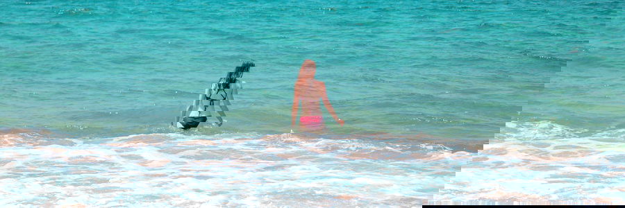 A woman in a bikini is walking into the ocean, with a tranquil beach setting. The sky is clear, suggesting a sunny day. AJ ๐ from Australia.