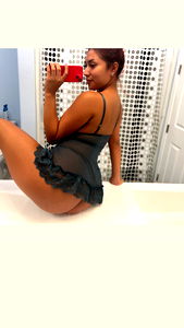An image of OnlyFans model, Sukii, dressed in a black lingerie. She is posing in front of a mirror with her hand on her head.