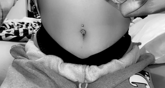 OnlyFans model showcasing her unique look, featuring a striking navel piercing and fashionable attire. A captivating image with a focus on body art and style.