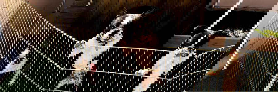 A promotional image of OnlyFans model Rai interacting with dogs. She is in the center, standing behind a fence with her three dogs, each on the other side.
