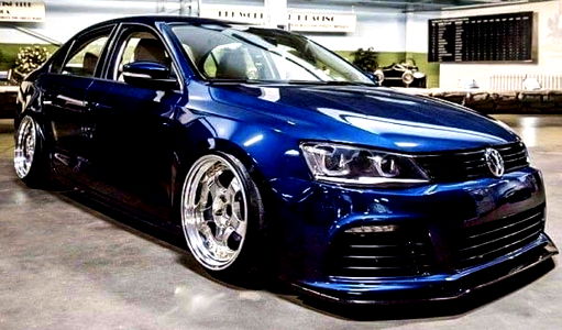 This image captures a striking blue Audi AMason parked in a warehouse. The car's unique modifications include custom rims, chrome accents on the hood, and a lowered stance. The attention to detail suggests that this vehicle is not just for transportation but also a symbol of personal style and automotive passion.