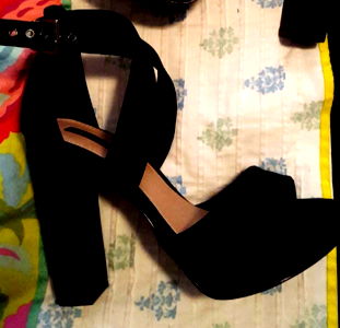 Photograph captures a close-up view of a person's feet wearing high heels with blue accents. It highlights the design details and textures of the footwear.