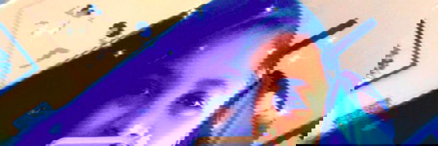 A close-up of a person with a colorful background, likely an OnlyFans model. They are wearing a white top and have their hair styled upwards.