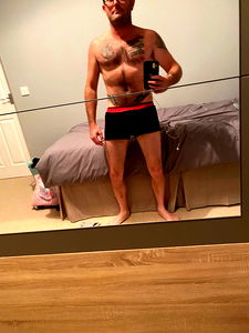An intimate portrait of the 'Amazad' model from Peterborough. A male age around 30 is captured in a private moment, showcasing his unique tattooed arm and playful pose. His gaze is directed towards the camera, creating an engaging and personal connection with viewers.