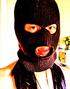 A photo of Gracie Yang wearing a black balaclava mask, which covers her face. She appears to be indoors with a white wall in the background.