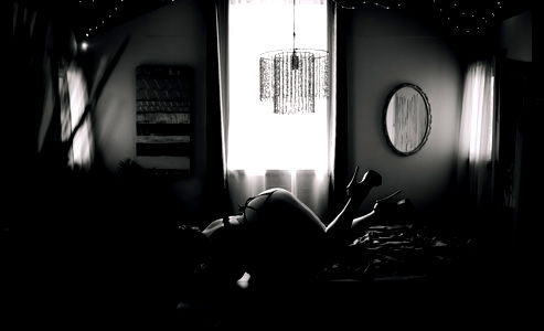 A black and white photograph captures a serene moment in a home office. The room is bathed in natural light from a large window, creating an atmosphere conducive to productivity. A single figure, partially obscured by the frame, sits at the desk, perhaps engrossed in work or lost in thought. The overall mood of the image is calm and peaceful.
