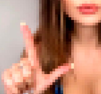 The model, Amba, is captured in a fun and casual pose. She is making a peace sign with one hand while pointing with the other. The image captures her cheerful spirit and showcases her unique personality.