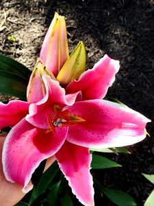 These beautiful pink lilies stand out against the green foliage, their bright color adding a touch of elegance to any setting. The flowers are in full bloom, with each petal vividly colored and tightly packed together. They make for a stunning floral arrangement, perfect for bringing life and freshness to your living space or as a lovely gift for someone special.