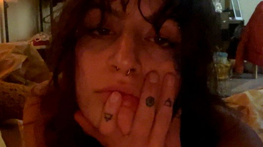 Amber, a vibrant influencer known for her bold and fashionable style, shares an intimate moment in her home. She's seen kneeling on the floor, her head resting gently against a wall as she captures her own reflection in a mirror with her smartphone. Dressed casually in a black tank top paired with white shorts, Amber exudes confidence and youthful energy. Her unique style and expressive eyes draw you into her world.