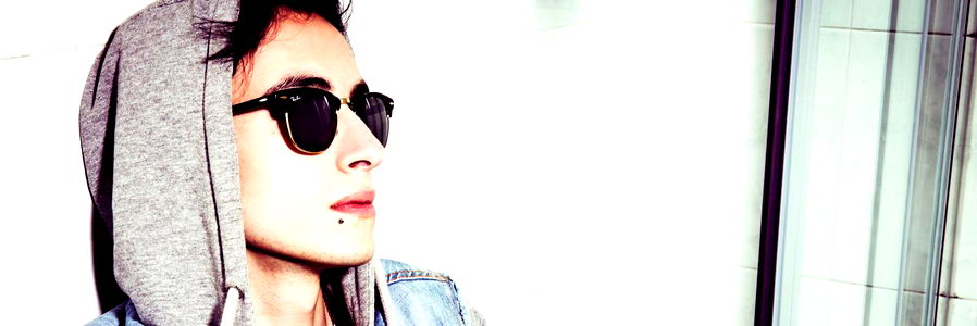 In this black and white portrait, Ambrose McQueen exudes a cool and relaxed vibe. He is seen sporting sunglasses and a casual outfit, standing against a light backdrop that highlights his presence. His gaze is directed off to the side, adding an air of mystery.