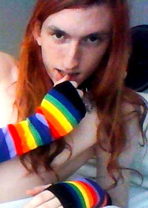 A young adult with red hair is the focus of this image. They are wearing a colorful rainbow sweater paired with tie-dye socks, showcasing a cheerful and lively personality. Onlyfans model Ambrosia_queenmatriarch is depicted in the photo, which seems to be a selfie taken in a cozy setting.