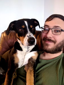 In this heartwarming image, Nic from West Memphis, Arkansas, shares a tender moment with his loyal canine companion on the couch. The dog's gaze into the camera captures the depth of their bond, while Nic exudes contentment in his glasses and blue shirt. They both seem to be enjoying some quality time together.