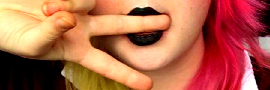 Amelia Quinn, a.k.a. 'In your mind', is seen showcasing her gothic look with pink and black face paint, intense eyeshadow, black hair, and dramatic lips. She wears a black choker necklace and has a playful expression. Amelia is known for her unique and expressive style.