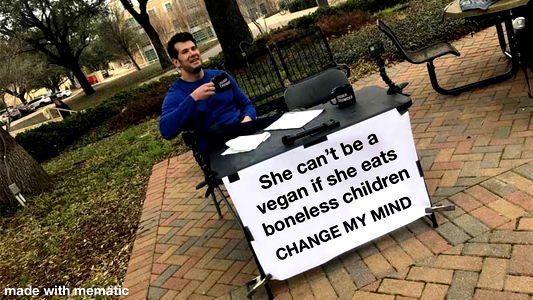 This is an image of a person, specifically a model named Gavin, sitting at an outdoor table with a humorous sign that reads 'SHE CAN'T BE A VEGETABLE SHE IS POOR, PAThetic, CHILDLESS, AND FULL OF MIND-BENDING BLIMEY. Changing my mind.' The setting appears to be a public space during daylight hours.