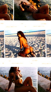 A collage of images featuring an OnlyFans model from Miami, posing in bikinis and beachwear. Images show her striking various poses, including lying down on the sand.