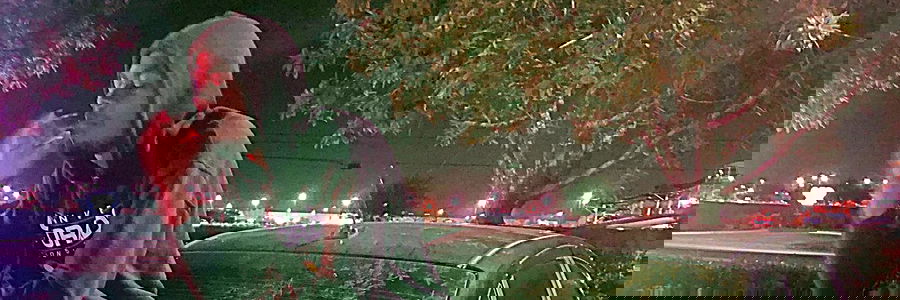 In the photo, a young man is standing in an urban environment. He's wearing a hoodie with the hood up and his head downwards. His expression is neutral and he appears to be waiting or observing something. The background features a parked car and streetlights, suggesting it might be night time.