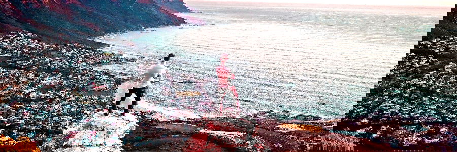 A breathtaking scene of a young adult standing on top of the world at sunrise, overlooking the city and coastline. The clear sky meets the calm ocean as day begins.