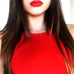 Amilia Herms is seen wearing a vibrant red dress. Her makeup, consisting of bold red lipstick, adds to her overall look.