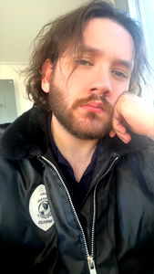 A bearded man with a contemplative expression sits in front of an OnlyFans badge, appearing relaxed yet thoughtful. He is adorned with a leather jacket and a chain necklace, adding to his edgy aesthetic.