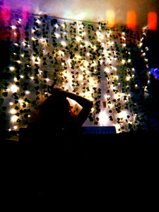 A vibrant DJ booth in a club featuring Amnesia Dreams decor, colorful lights, and a party atmosphere. The setting suggests a lively nightlife scene in Barcelona.