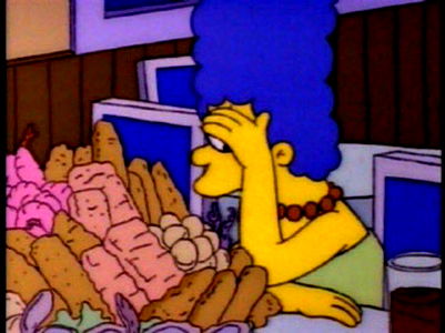 In this image, we see Homer Simpson, a popular character from the animated television show 'The Simpsons'. He is in his kitchen, which is filled with food that has either burned or is spoiled. Homer appears confused and overwhelmed by the mess before him. The kitchen looks chaotic, with food items scattered all over the countertops and floor.