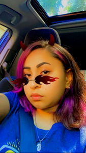 An image of a model with red sunglasses, purple hair, and wearing a black top. She appears to be in a car and is posing for the camera with a devilish grin.