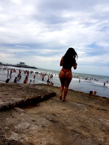 Stunning OnlyFans model Florencia, from Buenos Aires, strides confidently along the ocean shoreline. Her exotic beauty and alluring style are accentuated by her fashionable swimwear and beach accessories.