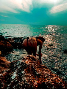 A stunning model photography session at a beach location, with the model posing in a glamorous and alluring manner. The image captures the beauty of the model amidst the serene setting of the shore. It's a vibrant scene filled with energy and style.