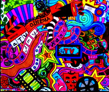 A colorful collage of various items and text related to movies, TV shows, music, and the internet, all in a graffiti-style art form.