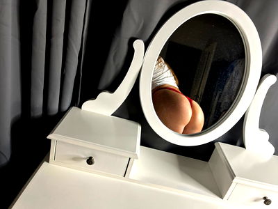 Amy is a successful OnlyFans model who showcases her physique and confidence. She's known for her fitness and the unique lingerie she wears. In this selfie, she stands confidently in front of a mirror, capturing her reflection. Her outfit consists of a sleek black lingerie that accentuates her curves, paired with matching high heels. The room has a casual atmosphere, with clothes scattered around and personal items like a handbag and a cup visible, indicating a lived-in space.