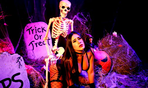Beautiful Colombian model Amy Reynolds showcasing her unique allure, seductive in a halloween-themed setting.